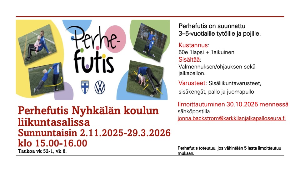 Hinta: 50 € / lapsi + aikuinen (sis. valmennuksen ja jalkapallon)